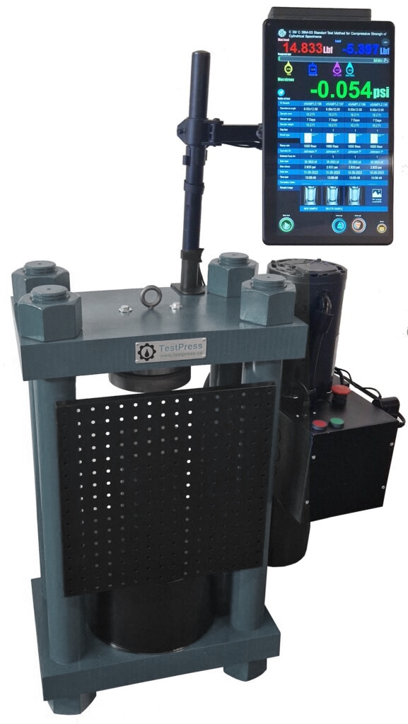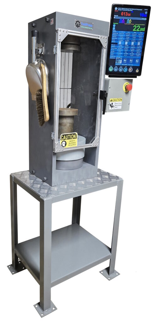 - Standard configuration includes platens to test 6″ x 12″ (150mm x 300mm) cylinders.
